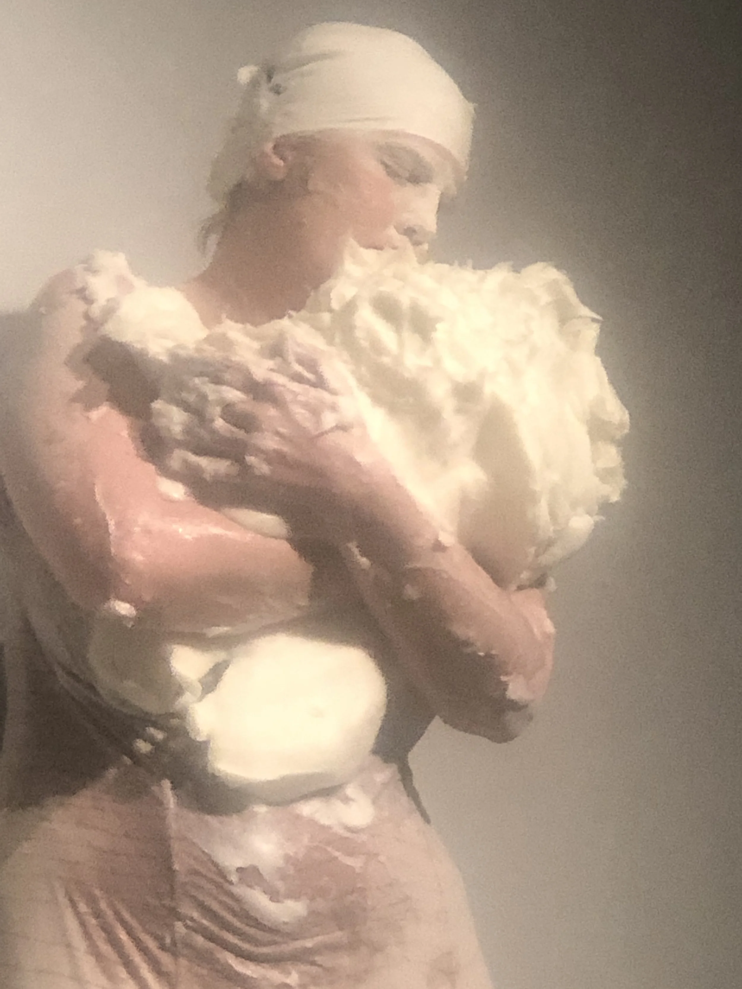 The performance then proceeds to pack forty pounds lard around vulnerable areas of the body- primarily the neck and shoulders, changing the body’s silhouette. As an example of somatics, anxiety and emotional damage manifest as physical weight. This emotional weight subconsciously builds physical armor in the body, for some victims not longer looking like themselves and for most, not feeling like themselves.