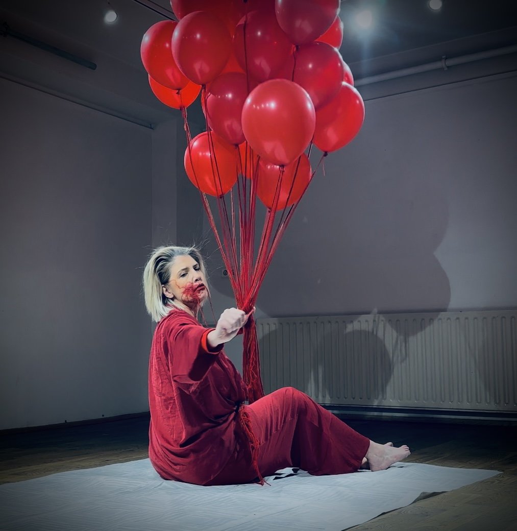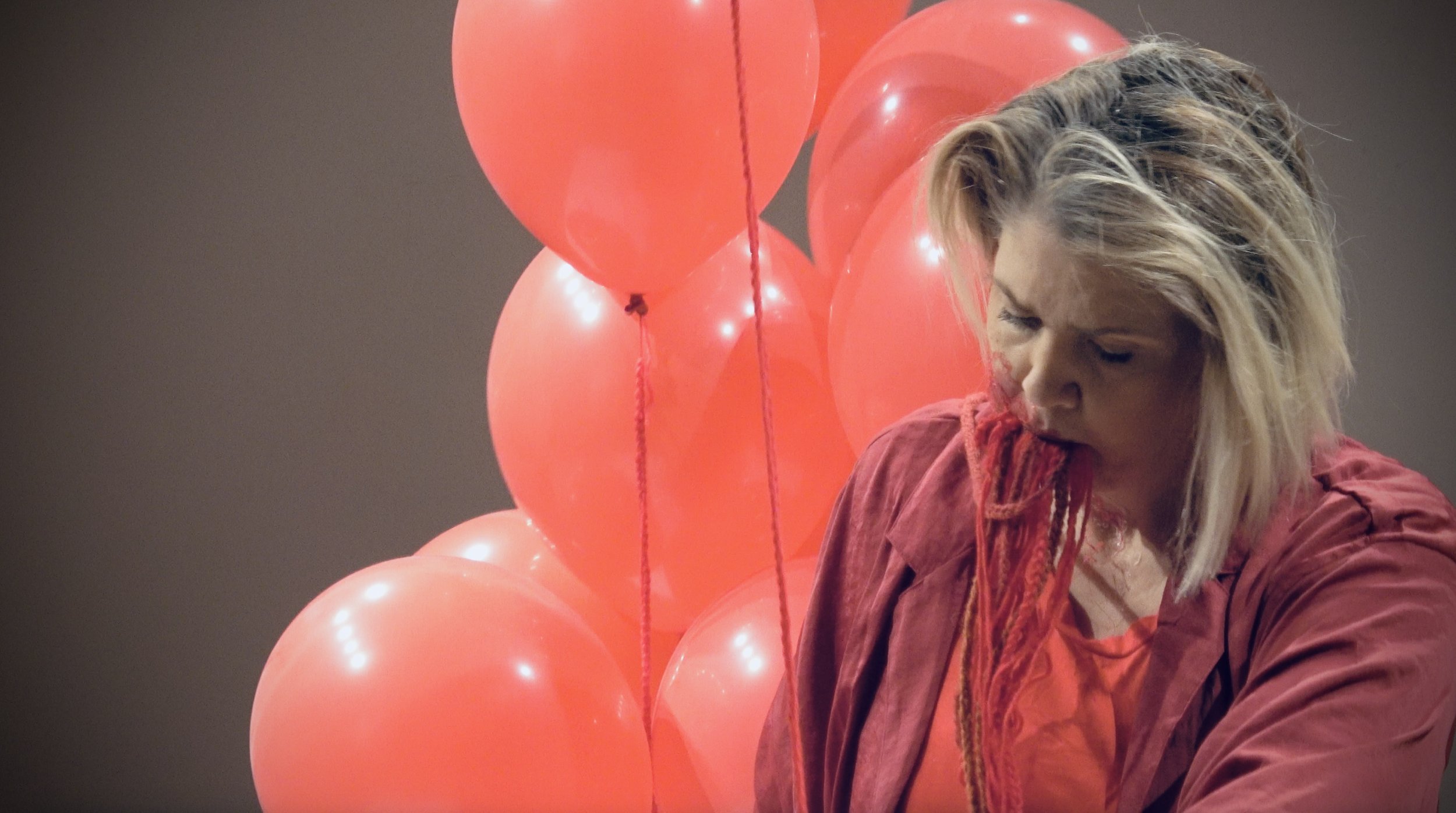 The performer sits on top of the quilt and holds onto a bundle of balloons. These balloons are meant to suggest pleasantries– moving on from pain. The tethers are crocheted but unravel from the performer, showing that mending or healing can be unraveled. As the performer looks to remain hold of the balloon, it pops and causes a trigger of past pain. The performer contends with uncontrollable tremors (but safe) evident to the viewer. This cycle of gathering and maintaining control is undone by the triggers- popping of each of the balloons until none remain. The performer gathers all of her labor and leaves the performance space.