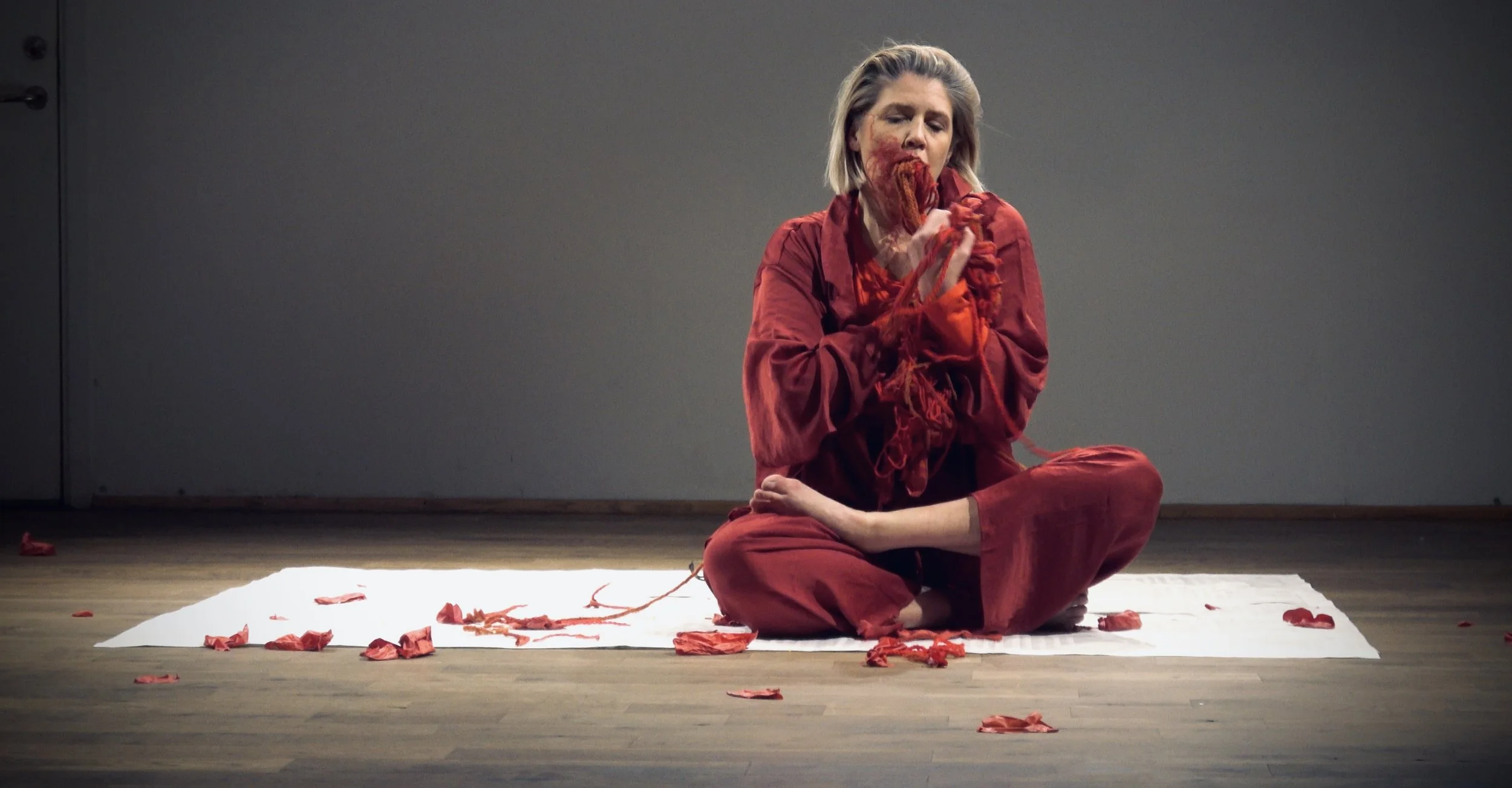 The performance is structured as a repetitive action. The performer is situated on top of a “log cabin” patterned quilt- historically a symbol of security. The quilt is lined with ash meant to imply history– her history, the collective women’s history, an overall purge of pain as the ash consists of burnt journal entries, essays, writing, artwork chronicling her experiences as a victim of violence and those who would like to contribute. The quilt ash is ever-evolving with contributions from people who wish to purge their pain and is evident through the light gossamer fabric is it made of.
